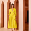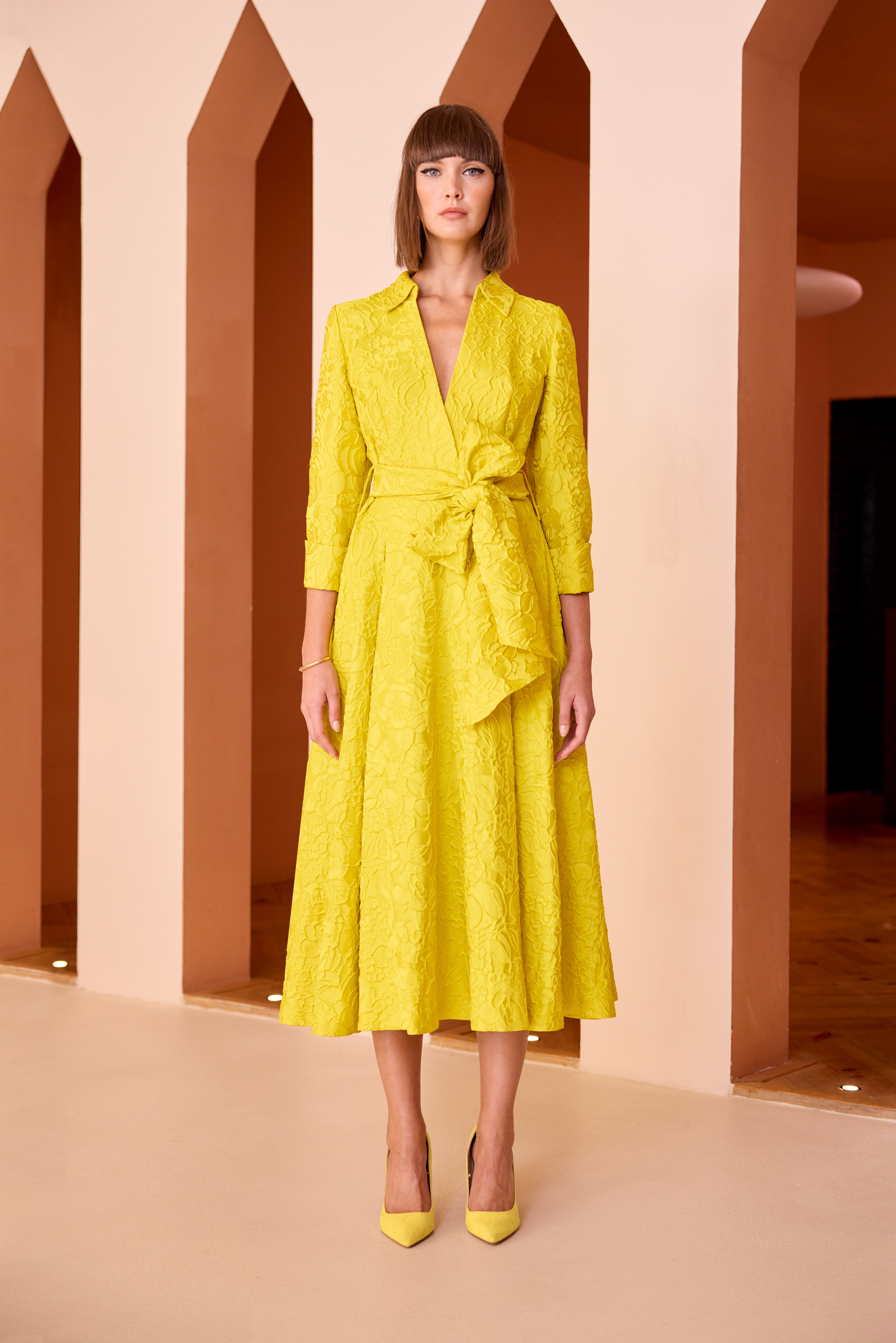 Vestido de Carla Ruiz. Corte camisero confeccionado en tejido brocado floral. Diseño de escote cruzado con lazada a la cintura y falda de vuelo en largo midi.