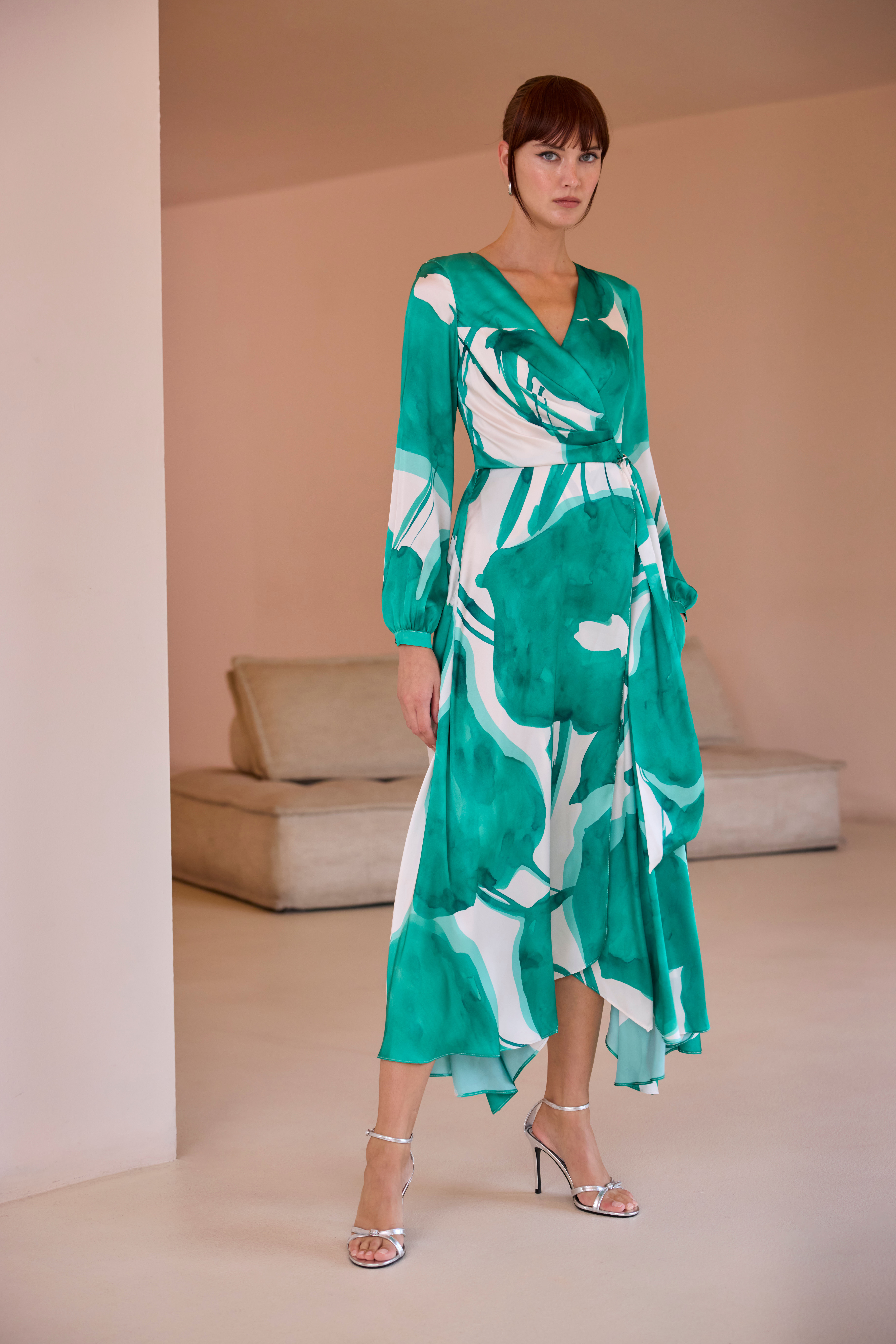 Vestido Carla Ruiz confeccionado en satén estampado. Cuerpo con escote pico cruzado. Manga abullonada y falda de picos en largo midi. Cierre de cremallera espalda.