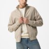 Casaco de corte regular em tom bege, com fecho frontal e punhos elásticos.