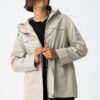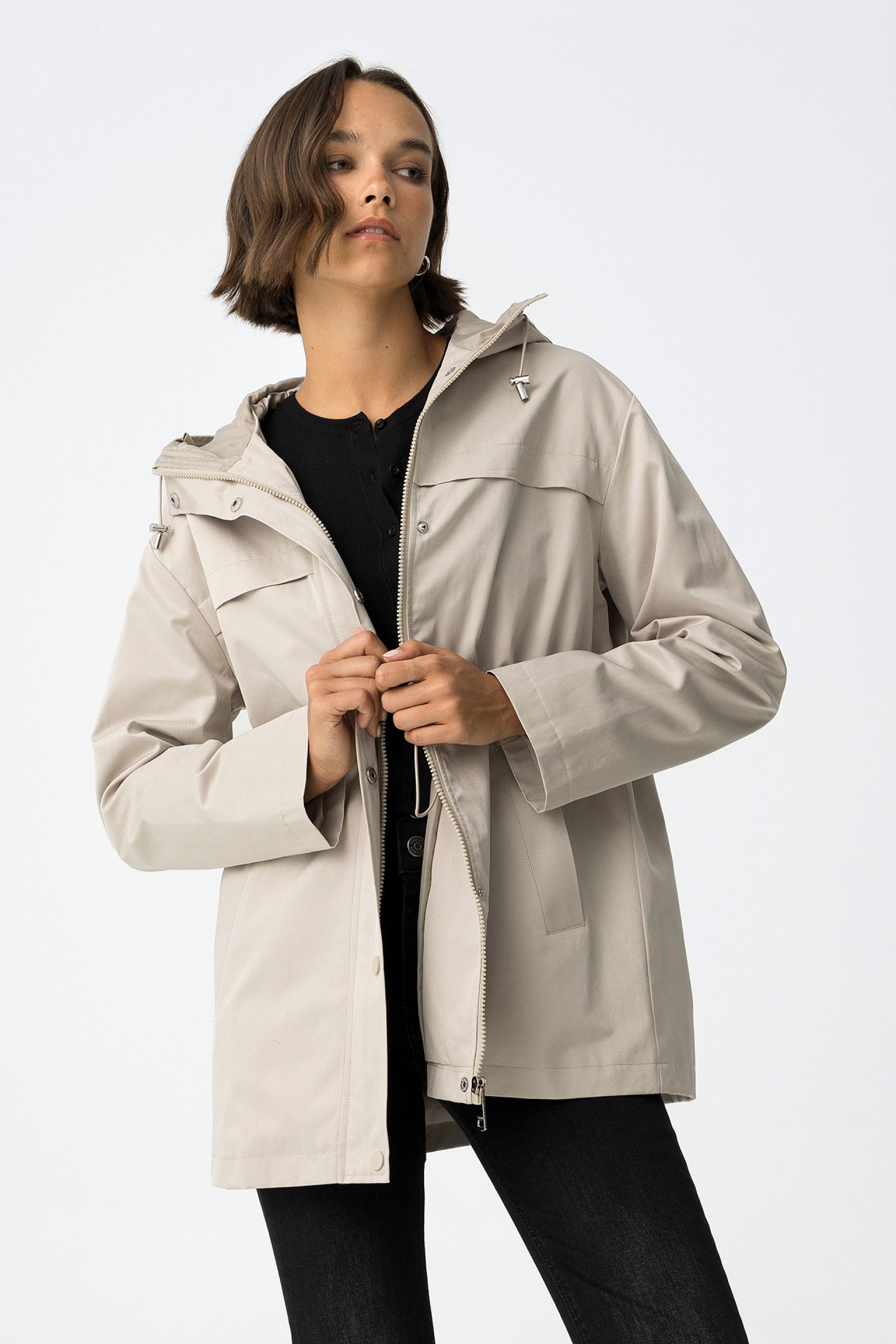 Abrigo corto con dos bolsillos frontales, capucha ajustable con cordón, cremallera reforzada con botones de presión y manga larga.