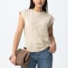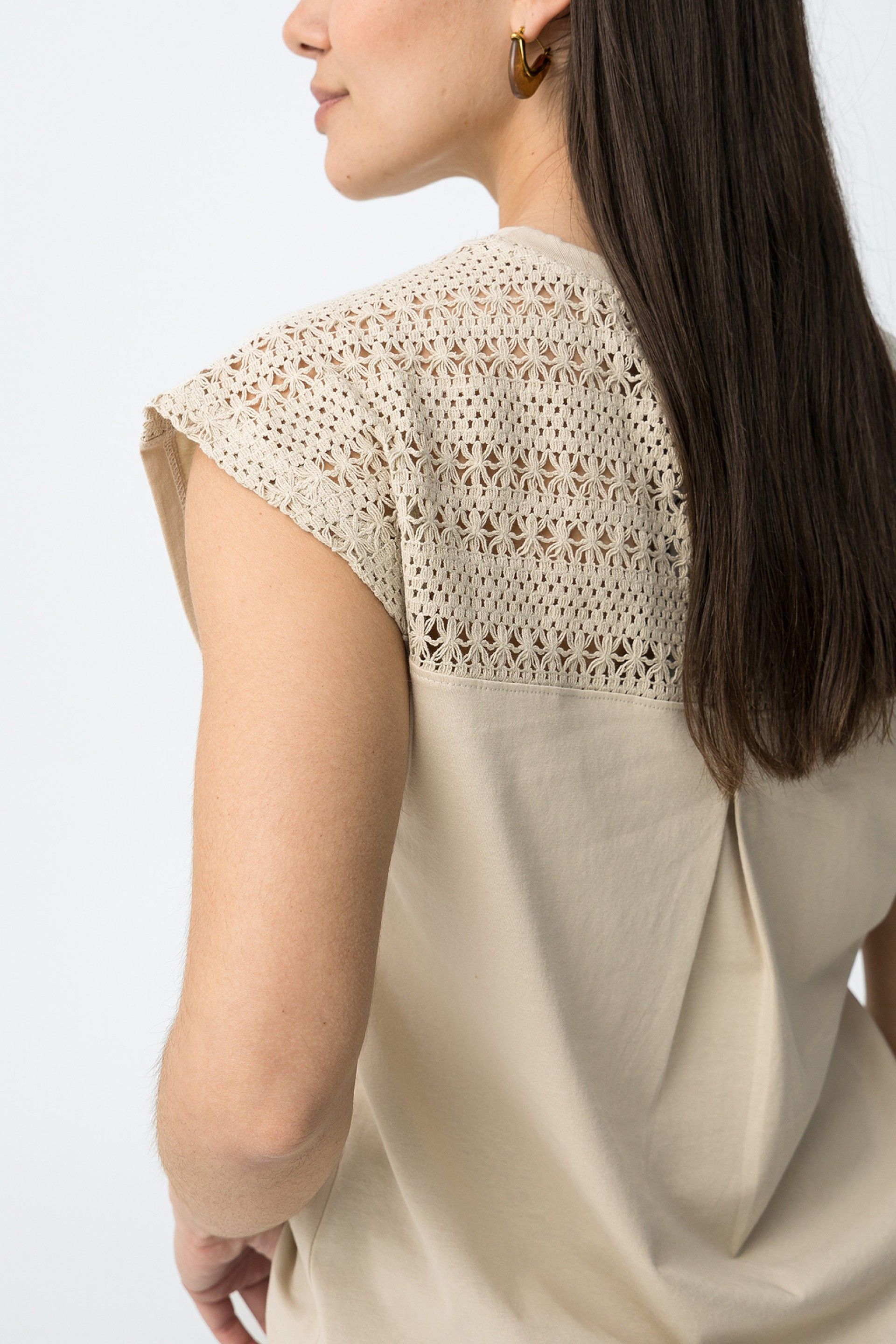 Camiseta beige de corte regular, encaje en hombros y print frontal en tonos neutros.