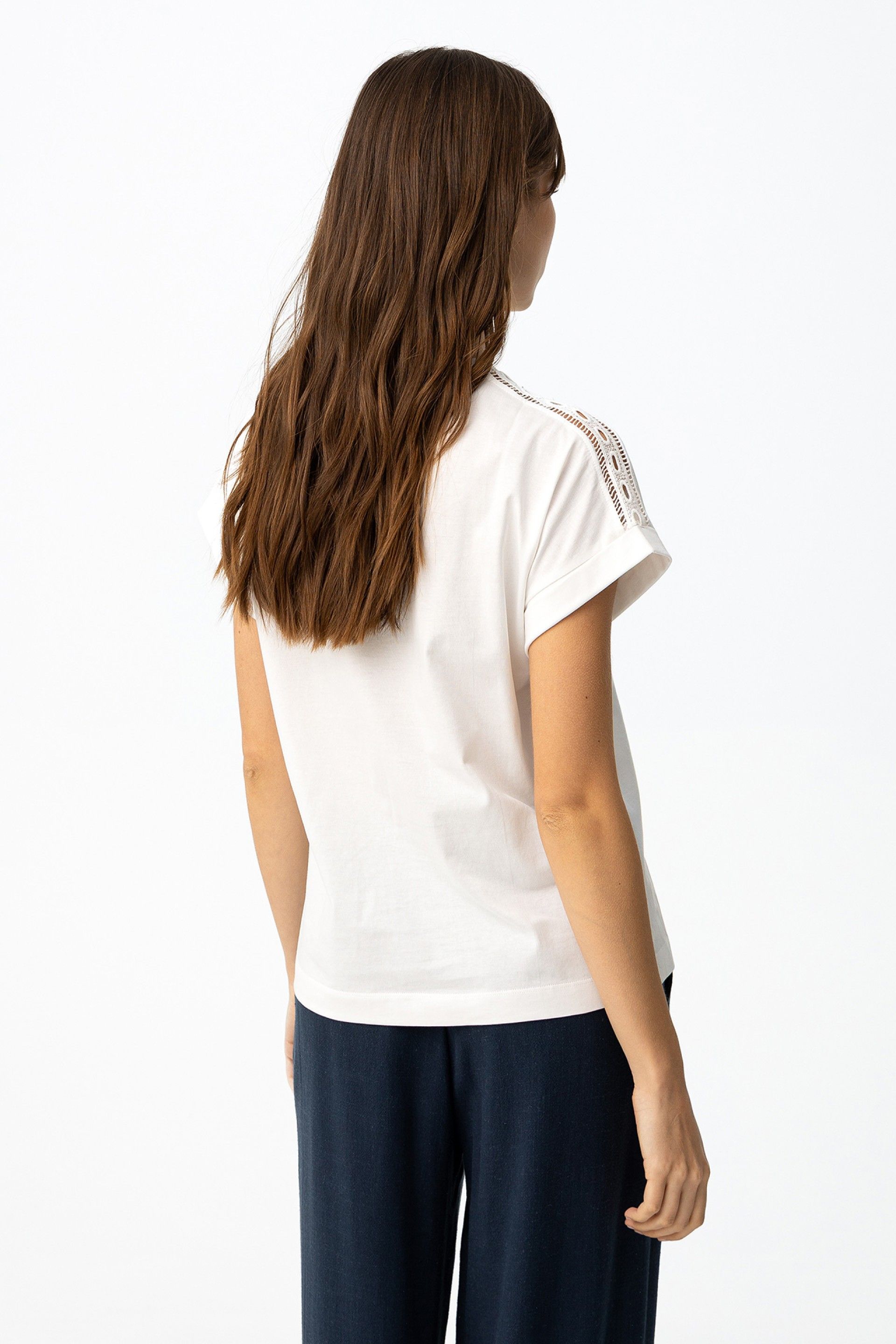 Camiseta blanca de corte regular, manga corta y estampado floral oscuro en la parte delantera.